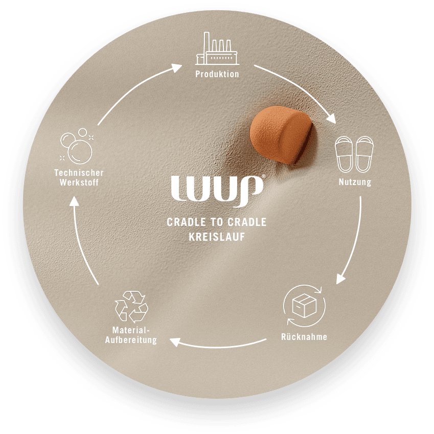 Wir sichern unseren Cradle to Cradle Kreislauf! Wir produzieren LUUP® für unsere Handelspartner, wir gewährleisten, dass die mit LUUP® hergestellten Schuhe und Produkte auch nach langem Tragen und Nutzen wieder in den Kreislauf zurückgegeben und wiederverwertet werden können. Egal wann und wo sie gekauft wurden. Unkompliziert und sicher.